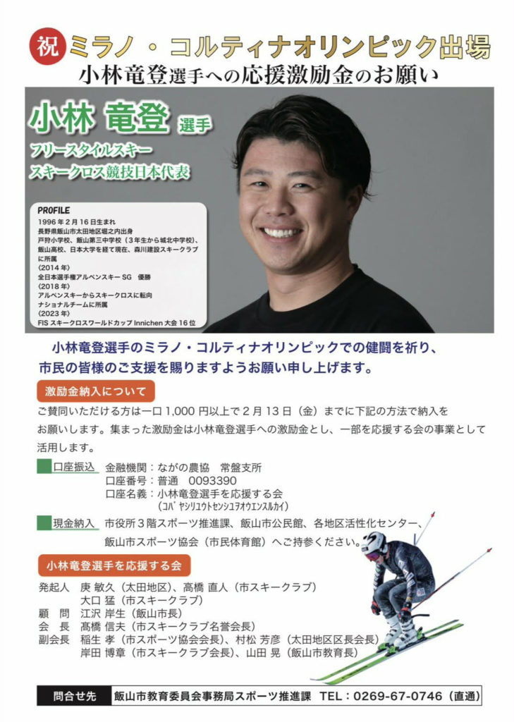 フリースタイルスキー、スキークロス競技日本代表の小林竜登選手が2026ミラノ・コルティナオリンピック出場が決定いたしました!出場決定に先立ちまして、「小林竜登選手を応援する会」が立ち上がっています。小林選手のオリンピックでの健闘を祈り、ぜひ皆様からのご支援をいただきますよう宜しくお願いいたします。